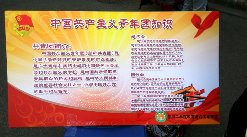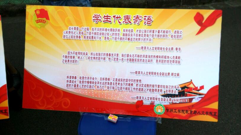 教育与人文学院所有团委学生会干部、班级主要班干部全部参与了此次活动。此次活动的“主角”是四块特色鲜明的展板:中国共产主义青年团知识、代表寄语、全体成员合影和祝福心语。“中国共产主义青年团知识”展板向同学们普及了团代会和学代会基本知识;代表寄语用“成长、青春、信念、力量”四个关键词发表了团干部的青春宣言;全体成员合影用青春活力的身姿展示了当代大学生积极向上的精神风貌;祝福心语展板则凝聚了所有同学对学校第六次团代会、第九次学代会深深的祝福和期待。