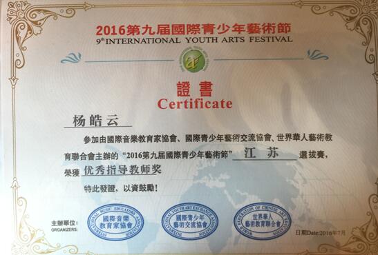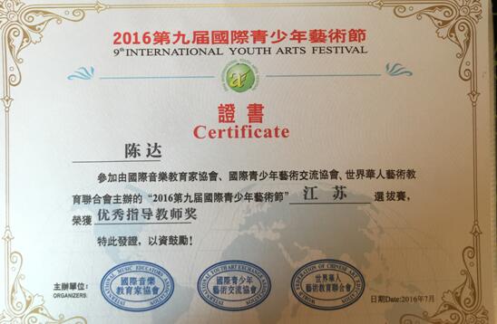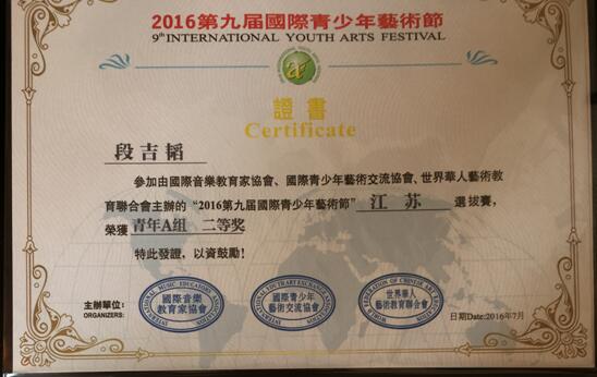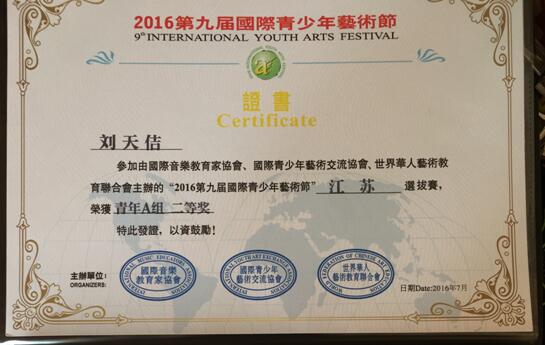 2016年7月,第九届国际青少年艺术大赛暨江苏省音乐公开赛在常州武进凤凰谷大剧院落下帷幕。我校教育与人文学院2014级学生刘天佶、段吉韬参赛,分别荣获青年组声乐、钢琴二等奖,指导教师为我校新引进的海归教师陈达和杨皓云,两位老师获得优秀指导教师奖。