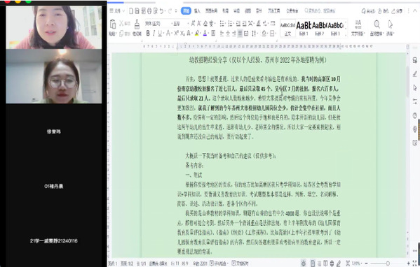 11月10日,学前教育系邀请2022届学前教育专业优秀毕业生沈璟洁校友,通过腾讯会议平台为学前教育专业三、四年级在校学生开展了考编讲座,系主任杨晓岚组织了本次活动。