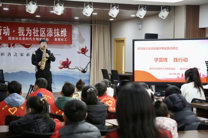 3月5日,学雷锋志愿服务队前往了三井街道国宾社区。志愿者们发挥专业特长,为社区带来了雷锋精神宣讲、红色歌曲演唱、器乐作品表演等服务活动。
