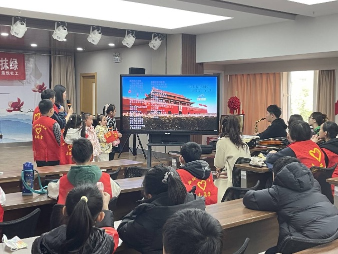 最后,志愿者们发挥专业特长,分别使用萨克斯、琵琶、单簧管、古筝、小提琴先后演奏了《南泥湾》、《少先锋队队歌》、《灯火里的中国》等红色作品曲目,将现场氛围推向了高潮。快乐的时光总是短暂的,在活动即将结束时,孩子们怀着依依不舍的心情与大学生志愿者们同唱了歌曲《我和我的祖国》。