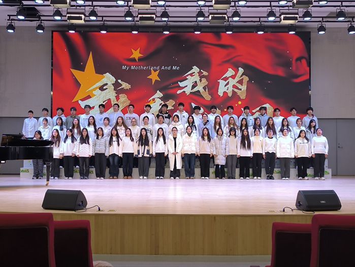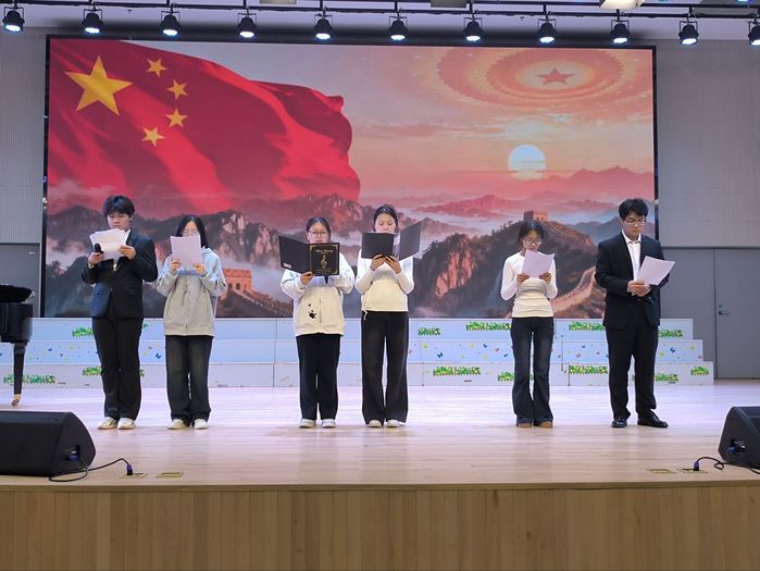 活动在慷慨激昂的朗诵《山河铸骨·青春破晓》中拉开帷幕。同学们以铿锵有力的语调、饱含深情的演绎,带领现场师生穿越时空,重回1935年那个风雨如晦的冬日,感受爱国青年为民族救亡振臂高呼的热血豪情,让红色基因在声声传诵中浸润心灵。邵闳霄同学为大家带来钢琴独奏《灯火里的中国》,灵动的琴音流淌间,勾勒出祖国山河无恙、万家灯火的盛世图景,将当代青年对祖国的挚爱与礼赞娓娓道来。司怡同学以徐特立先生的事迹为引,为大家带来激情豪迈的主题演讲,号召同学们要赓续红色血脉,为教育强国建设贡献青春力量,引发全场师生强烈共鸣,将活动气氛推向了高潮。活动在合唱爱国歌曲《我和我的祖国》中落下帷幕,嘹亮的歌声回荡全场,唱出了新时代青年对祖国母亲的美好祝愿。