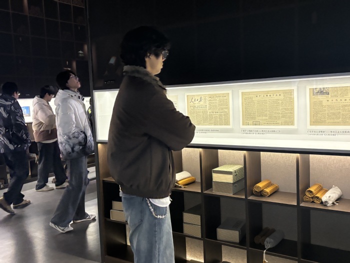 随后,同学们沿着“历史溯源—典故再现—文化传承”的参观路线,依次走进各专题展厅。在历史文献展区,泛黄的古籍善本、详实的考古报告与珍贵的文物拓片,全方位展现了季子在春秋时期的重要历史地位及其深远文化影响;在典故实景展区,“挂剑酬心”的场景复原令同学们身临其境,深切感受到一诺千金、生死不渝的诚信品格;“观乐知礼”的互动展项则让大家直观体会到季子深厚的礼乐修养。在教育思想展区,同学们重点研读了季子“教化为本”“以德育人”的理念论述,并结合自身师范生身份,就传统教育思想与现代师范教育的契合点展开热烈讨论。参观过程中,不少同学认真记录展陈要点,或用手机拍摄具有育人启示的图文资料,在沉浸式体验中汲取中华优秀传统文化的养分。