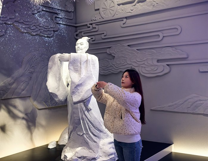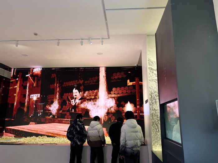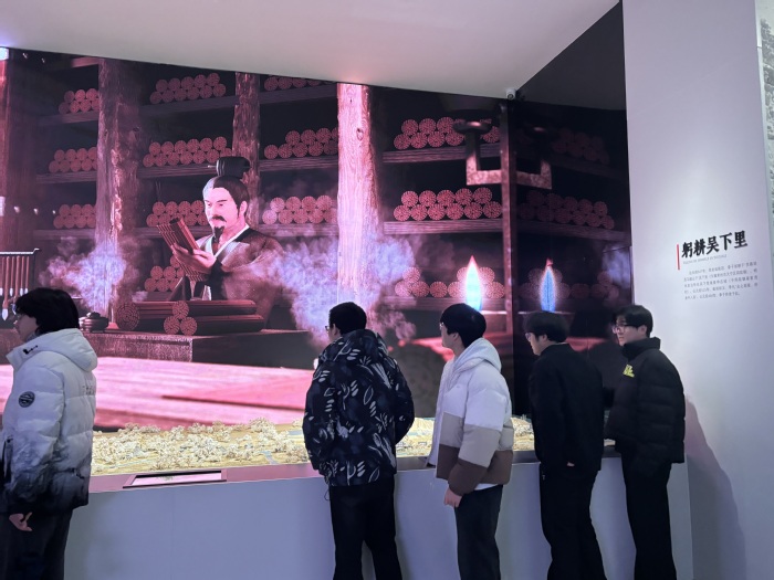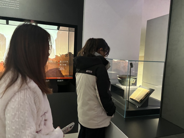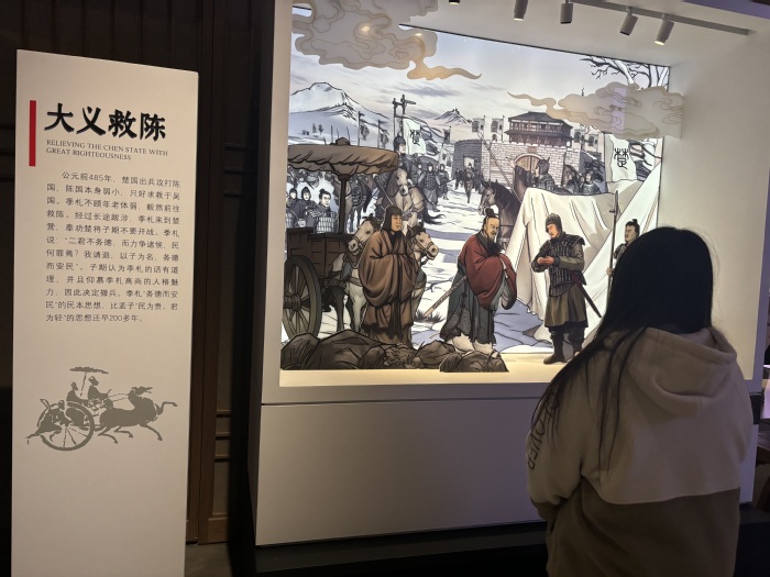 抵达季子文化中心后,同学们安静有序地步入序厅。映入眼帘的是镌刻季子生平轨迹的主题浮雕墙——从“季札让国”的谦谦君子之风,到“北学于中国”的求知进取精神,浮雕上的每一幕场景都生动勾勒出这位先贤的高尚品格。大家结合场馆提供的语音导览与展板文字,自主研读季子文化的起源与传承脉络,并在交流探讨中厘清历史线索,为后续的参观研学奠定了扎实的知识基础。